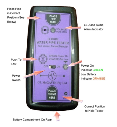 The GLM Mini Water Pipe Tester has been designed for testing mains and secondary water pipes, in commercial and residential areas to detect a fault current over a preset current of 2.1 amps. The unit is designed for qualified and trained personnel in the electrical and plumbing fields.