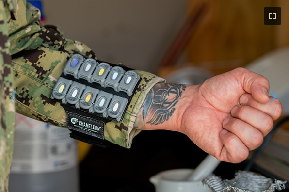 The Chameleon is the only hands-free, power-free, chemical detector for gases and vapors in air, allowing First Responders, Firefighters, EMS, Police Officers and Military to detect the presence of hazardous chemicals. No liquid sample required. The Chameleon may even be immersed in salt water or fresh water without affecting its performance. Developed under funding by the United States Marine Corps, the Chameleon is ideal for users to screen unknown hazards in their environment