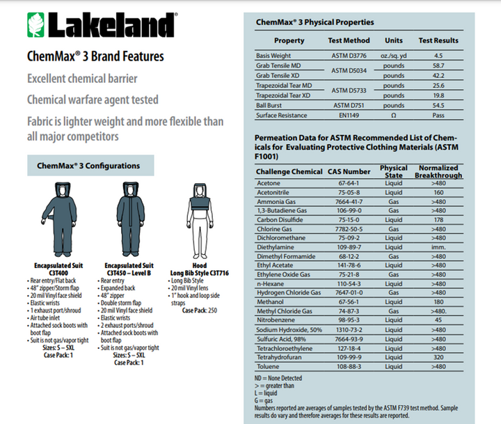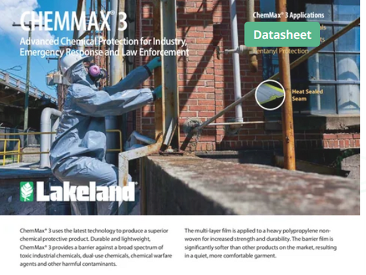 C3T450 Durable and lightweight, Lakeland ChemMax 3 uses innovative materials and design for a superior chemical suit. This encapsulated suit with rear-entry and expanded back provides a barrier against a broad spectrum of toxic industrial chemicals, dual-use chemicals, chemical warfare agents, and other harmful contaminants. Perfect for emergency response agencies.