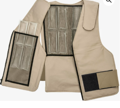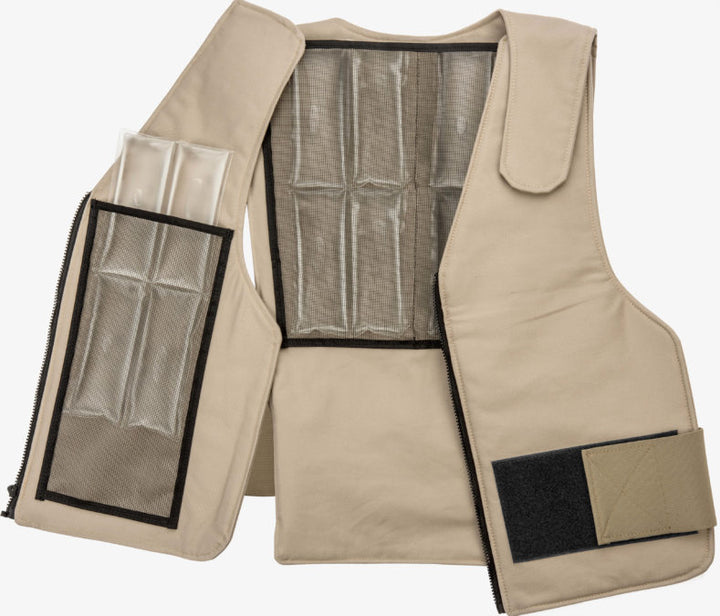 CV55 features adjustable waist and shoulder straps with space to insert cooling packs. Made with a polycotton material.