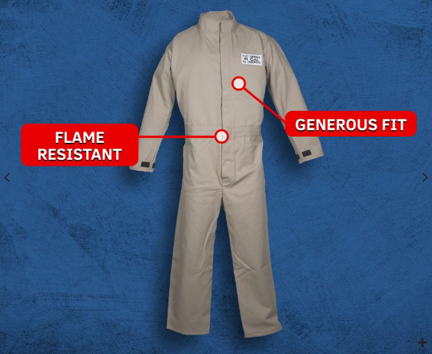 - Coveralls are made from a fire resistant blend of treated Cotton.