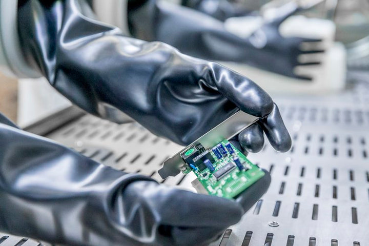Natural Rubber Latex (Polyisoprene) One-piece glove, has greater flexibility while still maintaining a strong resistance to alcohols, acids and diluted bases. Uses include but are not limited to sand blasting and dry chemistry/environment.
