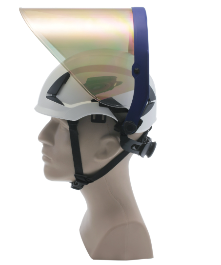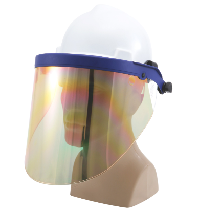 Injection molded gold-on-clear face shield window. For high heat mill & foundry operations. Includes gold coating & protective hard coating to extend service life of the shield. LeverLock® hole pattern compatible with Paulson weight-compensating brackets for slotted cap hardhats and safety helmets.
