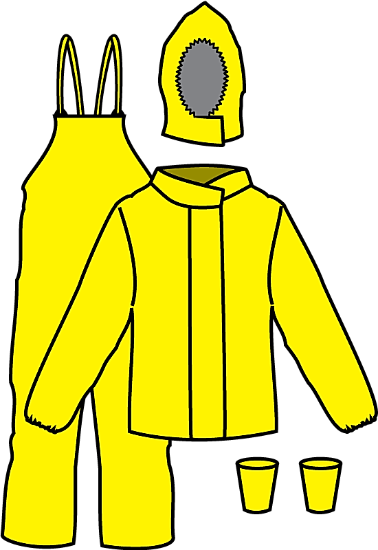 jacket with Collar, Hook and Loop Adjustment Straps at Wrists, Bib Overall with Hook and Loop Adjustment Straps at Ankles, and Attachable Hood. Includes Glove Cone Inserts.