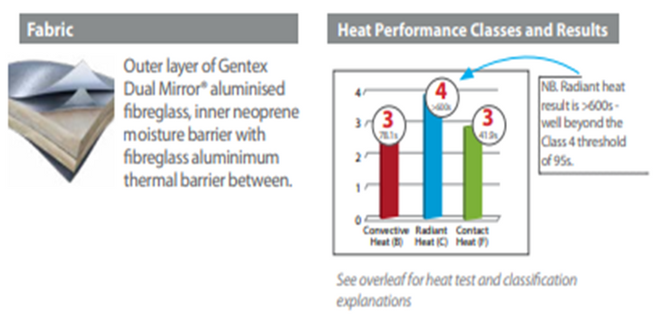 Hood includes gold reflective heat shield. • Class 4 (highest class) protection against radiant heat. Note: the actual result is >600s. The threshold for