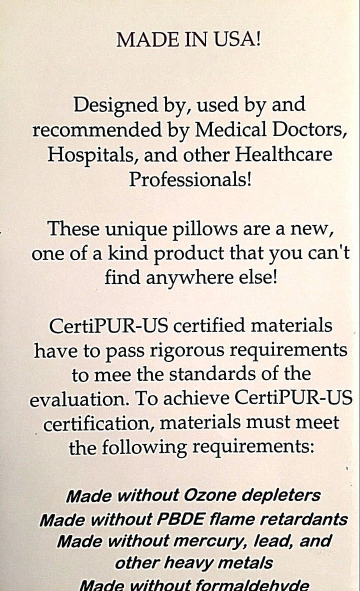 With guidance of medical doctors, chiropractors, physical therapists, and dentists we developed a full medical grade pillows/bolsters that are antibacterial, anti-fungal, formaldehyde free, no heavy metals, pink stain resistant, stain resistant, sulfide stain resistant, flame retardant UL900/California T.B. 117-2013, and with CertiPUR-US Certification.