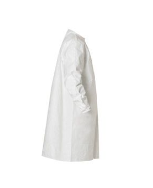 white DuPont IC270B Tyvek IsoClean Frock Bound Seams Bound Neck Set Sleeve Design Covered Elastic Wrists Front Snap Closure