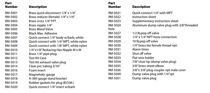 Part Number Description: RM-5001 Brass quick disconnect 1/4” x 1/4” RM-5002 Brass reducer (female) 1/4” x 1/4” RM-5003 Brass cross 1/4” FPT RM-5004 Brass nipple 1/4” RM-5005 Brass Bleed Valve RM-5006 Black Max. Adhesive RM-5007 Quick connect 1/4” body w/barb, white RM-5008 Quick connect with 1/4” MPT, white nylon RM-5009 Quick connect with 1/8” MPT, white nylon RM-5010 1/4”x1/8” Reducing Hex Nipple M x M RM-5011 Brass 1/4” pipe plug RM-5012 Test Kit Case RM-5013 Test Kit exhaust valve plug RM-5014 Clear pvc tubing 3/16” RM-5016 Foam insert RM-5017 Magnehelic gauge RM-5018 A-369 gauge stand bracket RM-5019 Rubber gaskets for plug (B.O.M.) RM-5020 Quick connect 1/4” insert w/barb Part Number Description RM-5021 Quick connect 1/4” with MPT RM-5022 Instruction sheet RM-5023 Supplementary instruction sheet RM-5024 Aluminum dump valve plug with 3/8”threaded hole RM-5027 1/2 lb.pop off valve RM-5028 1/4” x 1/4” NPT hose connection RM-5029 10 lb.pop off valve RM-5030 1/4” brass tee female thread npt. RM-5031 Alarm timer RM-5032 Shut off valve RM-5033 Flat wire holder RM-5034 7/8” chair tip (dump valve plug) RM-5035 3/8” brass street elbow RM-5036 3/8”x 3/8” plug coupler npt male conn RM-5049 Dump valve plug with 1/4” ipt RM-5051 Dump valve plug
